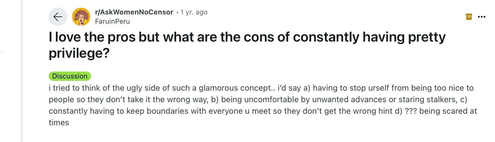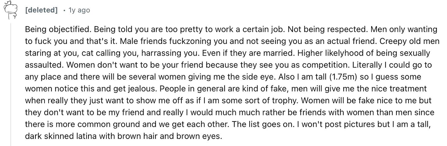 There so much I could say about this. I have actual goosebumps reading. I remember being so young and learning how much the way I look affected my life. I felt objectified and sexualized before I even knew what those words meant. I hadn't really grown out of my awkward phase until around 15-16, but when I did I felt like the world noticed me finally. Was it my looks that determined my worth? That's what I internalized. When all anyone ever seems to notice is your appearance, it starts to become everything. It was around this time that I began struggling with eating disorders, body dismorphia, and had a sudden obsession with my looks. And these are just the internal struggles. I have felt unsafe in places such as gas stations, parking lots, stores, and even my places of work more times than I can count. Being pretty is one thing, but when everyone sees your looks as an open invitation to consume you however they want- we have to consider the true price at which this privilege comes.