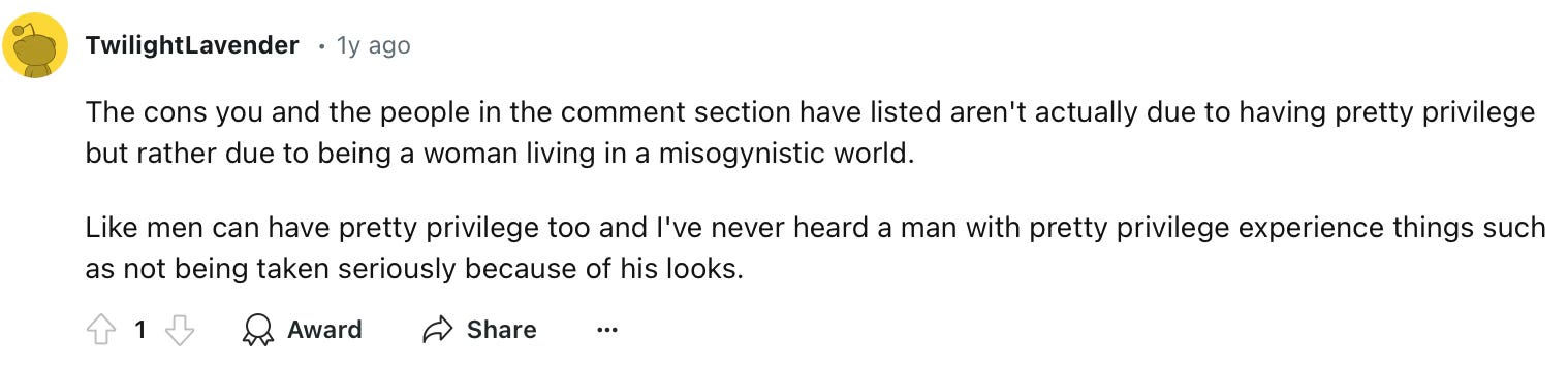 When I first sat down to write this piece, I was going to explore the pros and cons of pretty privilege… but why? To convince people that being pretty is a burden? I didn't know what my angle was or why I felt called to write on this topic. After scrolling through the depths of Reddit and reflecting on the topic more, I came to the conclusion that the pros do indeed outweigh the cons. So, I closed my laptop and carried on with my day, thinking that this piece was not meant to be written. But I had this nagging desire in the back of my head to write something…